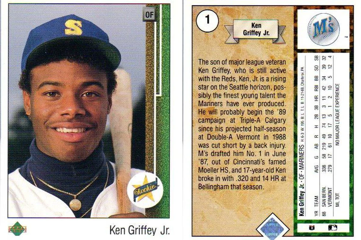 I never did save up enough money for that card but I did end up getting it in the Spring of 1990. I was in the 4th grade and it was on a Wednesday when school let us out early for our weekly half days. After we crushed some pepperoni pizza and video games at Round Table Pizza we hit Marcy Park for our weekly game of tackle football. My buddy Mickey showed up that afternoon a little bit late on Wednesday, February 28th, 1990 with an early birthday gift for me. It didn’t have any gift wrapping and that almost made it better. Mickey got me what I had been fiending for. In 1990 I finally got to add that 1989 Upper Deck Ken Griffey Jr. rookie card to my baseball card collection. Mickey told me that it cost him $30 which was a lot of money for a gift and it will always go down as one of the best presents I’ve ever received from a friend. I still own that treasured card and I believe it still might be in the same case it was in that day I received it in 1990. A lot of baseball cards are memorable but there is nothing that claims that #1 spot like this iconic card below.